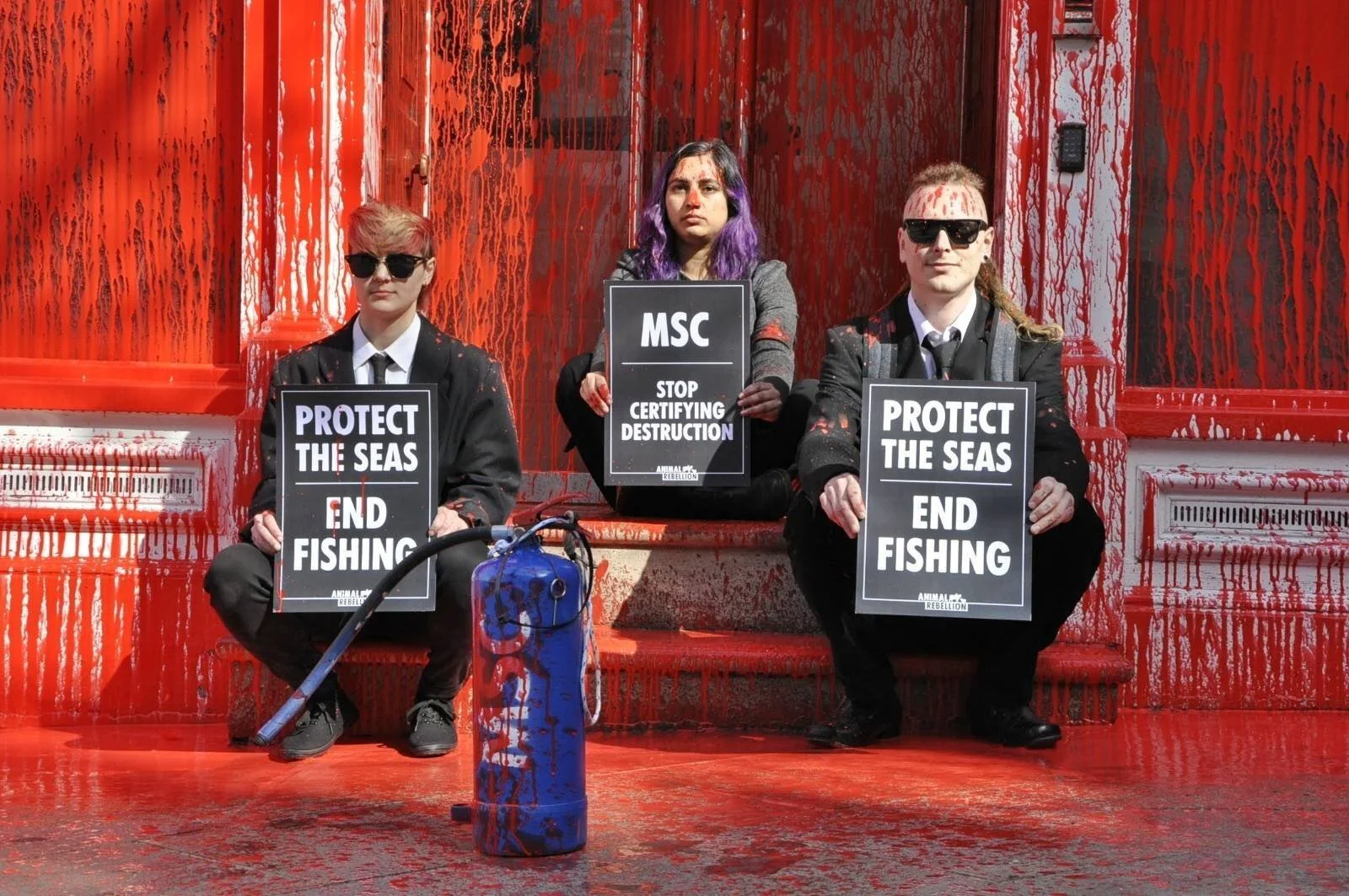 Yesterday the facade of the Marine Stewardship Council (MSC) offices in London were dripping in ‘blood’. Four activists from Animal Rebellion used modified fire extinguishers to spray the building with red paint to demonstrate the MSC’s support for killing marine life through its fisheries certification scheme. The activists held placards that read “Protect the Seas – End Fishing and MSC – Stop Certifying Destruction.”