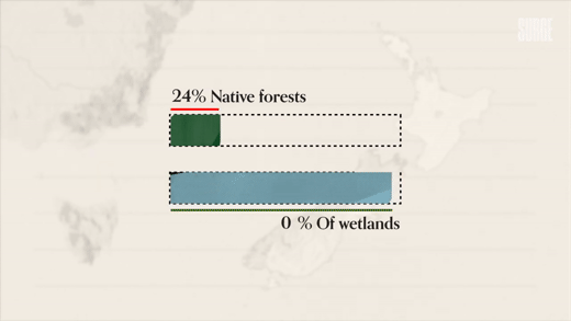 Before humans lived in New Zealand, around 80 per cent of the landmass was native forests, now only 24 per cent is native forests. Not to mention that 90 per cent of New Zealand’s wetlands have also been drained or filled as well - and in the place of a lot of these native forests and wetlands, there are now pastures for animal farms. In fact, according to this report from the New Zealand government, 40 per cent of the total land area of New Zealand is exotic grassland, which means land covered with non-native grasses used for pasture including dairy, sheep and beef farming. Compare that to the two per cent that is used for horticulture and crop farming.